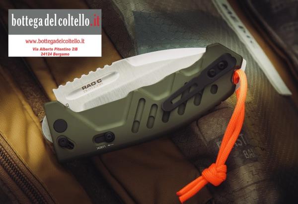 RAO C Outdoor is a compact, robust folding knife derived from the iconic RAO II, reinterpreted specifically for outdoor use. It retains the core design philosophy of the RAO C model: maximum structural strength in a more portable format, combined with excellent handling and control. It is intended for users who require an outdoor folding knife capable of performing reliably under load.