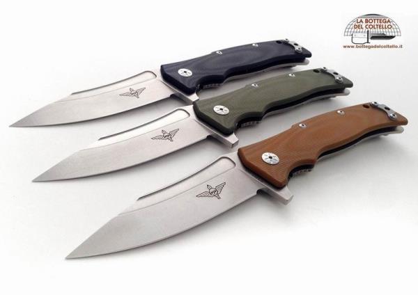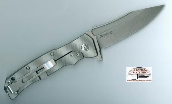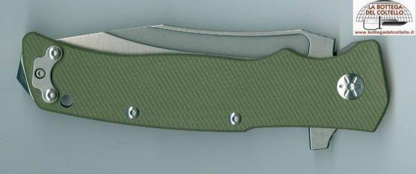 Maserin Art. 681/G10V REACTOR folding knife - Description published by the manufacturer: Blade: Steel D2 HRC 58/61 - Blade finishing: Stone washed - Blade length: 110 mm, 4,33" - Total lenght: 245 mm, 9,65" - Mechanism: flipper with ball bearings - Frame: Titanium - Handle: green G10 - Clip: reversible, stainless steel - Window breaker: stainless steel - Weight: 158 gr, 0,54 lbs. Made in Italy. Packaging: black cardboard box.