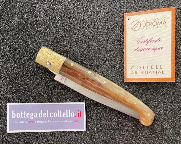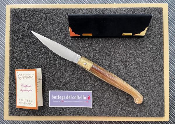 Resolza, typical Italian folding knife 12 with MA5M steel blade, decorated brass ring and ram's horn handle. Made in Italy.