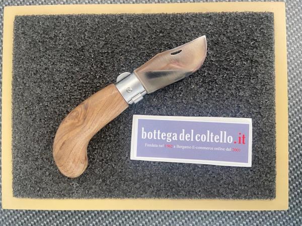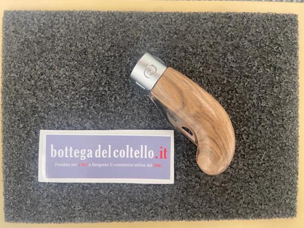 Stainless steel blade. Lock blade. Walnut wood handle. Overall length 14,5 cm, blade 6 cm, closed 8,5 cm. The natural striations of the handle may be different from that reproduced on the image.