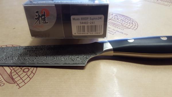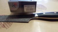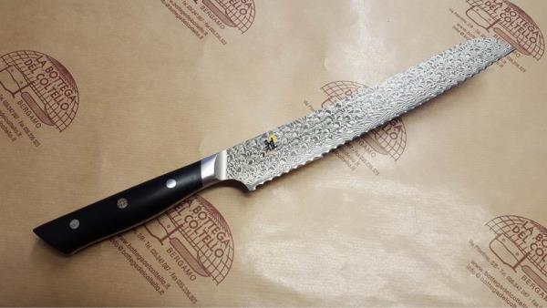 Zwilling Japan item 54486-241 Bread 240 49-layers San Mai blade. Fine carbide cutting center = FC61. Hibana - damask flower. Brass spacers. Central mosaic pin. Blade length 24 cm. Packaging: plastic and cardboard box.