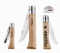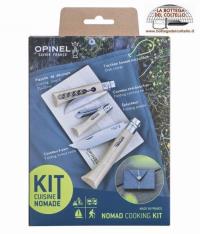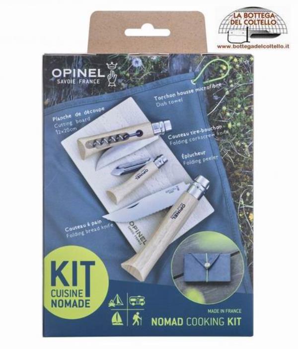 Nomad cooking kit prodotto in Francia da Opinel contiene un coltello tascabile pelaverdura, un coltello tascabile con lama seghettata da 12 cm, un coltello tascabile con cavatappi chiudibile e con lama da 10 cm, un tagliere in faggio e un canovaccio in microfibra da usare come custodia per il trasporto. Manici in faggio verniciato, lame in acciaio inossidabile. Confezione in cartoncino 160x21x53 mm.