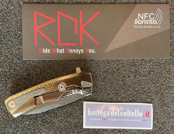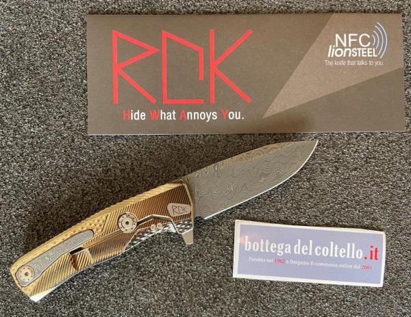 Coltello pieghevole Rok damasco modello ROK DD GL con lama in acciaio Damasco Scrambled Chad Nichols. Il Design è di Molletta, mentre tutte le parti tecniche e meccaniche sono state sviluppate da LionSteel.