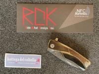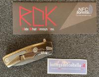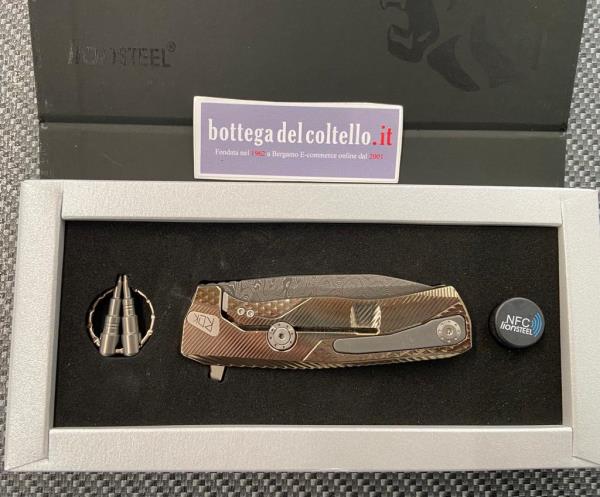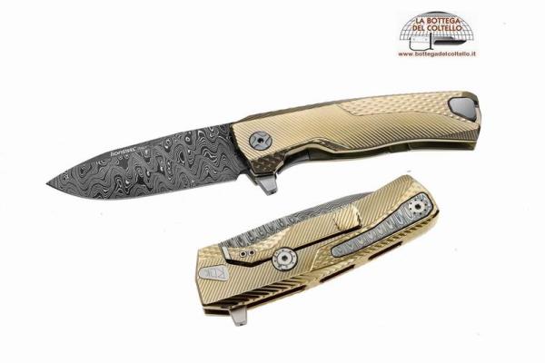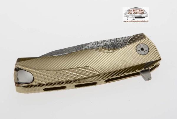 Specifiche tecniche pubblicate dal produttore: Variante: Color ORO - Lunghezza totale: 198 mm. - 7.80 in. - Lunghezza lama: 86 mm. - 3.39 in. - Spessore lama: 4.5 mm. - 0.18 in. - Peso netto: 157 gr. - 5.54 oz. Scocca: Titanio 6Al4V Acciaio lama: Damasco Scrambled Chad Nichols.