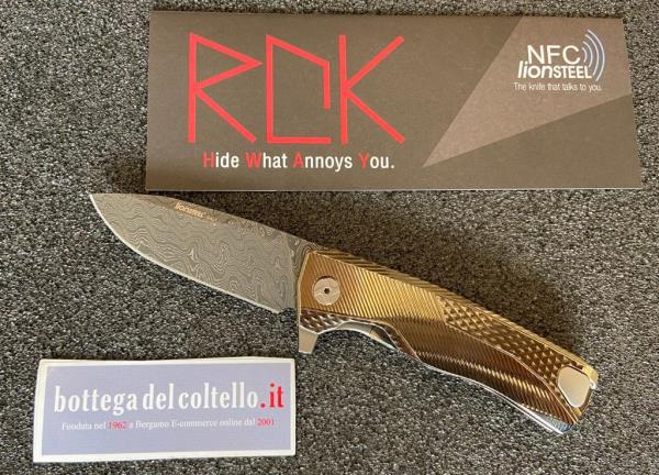 ROK è il nuovo coltello LionSteel 2018. Il disegno è di Molletta Design, mentre tutte le parti tecniche e meccaniche sono state sviluppate da LionSteel. Questo coltello ha due importanti innovazioni. La prima è l'introduzione del nuovo sistema H.WAYL System. Si tratta di un brevetto LionSteel che permette di far scomparire la clip all’interno del manico durante l’utilizzo del coltello. La clip può apparire solamente nel momento del bisogno. La seconda innovazione è l'introduzione della tecnologia NFC nella scatola del coltello. Con questo sistema l’utente non deve più cercare le informazioni sul prodotto, ma è il coltello stesso a renderle disponibili: indicazioni per la manutenzione, approfondimenti sul processo produttivo, o informazioni più generali su LionSteel. Come per il modello TRE, c'è la possibilità di togliere il flipper ed obbligare l'apertura della lama con due mani. Anche questo coltello fa parte della famiglia dei SOLID, ottenuti da un pezzo unico di Titanio. Il manico è dotato del sistema di sicurezza Rotoblock e di un puntale in acciaio sull’estremità della barra di blocco lama: in questo modo si prevengolo possibili rotture o usure causate dalla lama stessa.