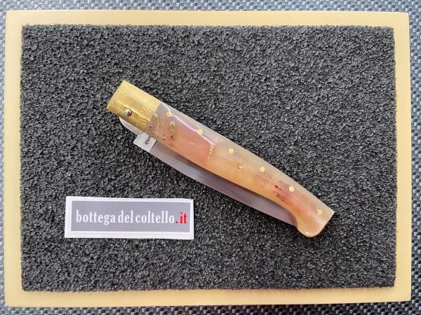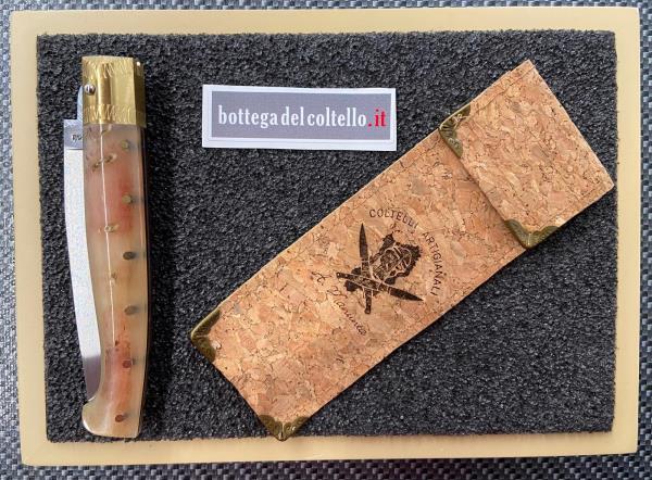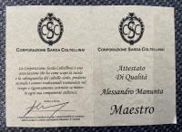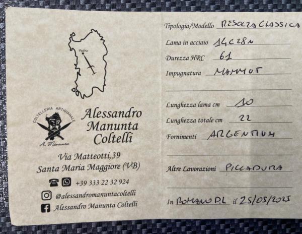 Il maestro della Corporazione Sarda Coltellinai, Manunta Alessandro ha realizzato artigianalmente questa resolza, con manico il corno di montone di coppia, lama in acciaio Nitro B con durezza Hrc 59 e fornimenti in ottone. Misure del coltello: lunghezza totale aperto mm.238 lama mm.107 collare in ottone decorato con Piccadura