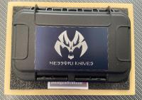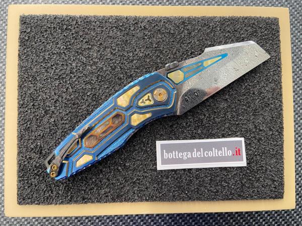 Messori Manuele knife. I coltelli elaborati dal coltellinaio artigiano emilianoManuele Messori, modello Hybris Mandalorian liner lock, damasco, titanio, madreperla e zirconio. Lunghezza totale 195 mm chiuso mm 120 spessore manico mm 15 spessore lama mm 4 lunghezza tagliente mm 86. Lama in damasco inox Damasteel Odin Heim ( RWL34+PMC27) 59 Hrc guancette in titanio GR5 fornimenti e inserti in madreperla oro, titanio e Zirconium.