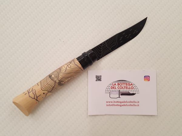 Azimut, richiama la cartografia di montagna. Le curve di livello sul manico e sulla lama nera richiamano la Catena Aiguilles d’Arves in Savoia, Massiccio della Moriana, patria di Opinel.