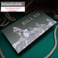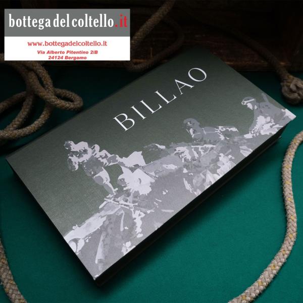 L’impugnatura è realizzata in corno di bufalo, un materiale tradizionale che aggiunge autenticità al design. Il fodero è realizzato in cuoio e dispone di passanti e stringhe che permettono di fissarlo ai fianchi. È stato appositamente progettato per accogliere sia l’impugnatura che l’elsa, mantenendo la praticità e l’originalità del coltello Billao.