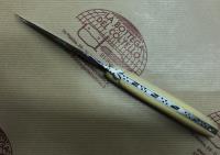 Molla di tenuta e cartelle decorate a mano. Impugnatura in bosso. Lunghezza totale coltello aperto mm.220 chiuso mm.118 parte tagliente della lama mm.90. L'impugnatura può avere striature naturali diverse da quella riprodotte nell'immagine.