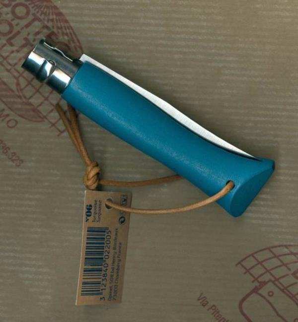 Opinel 06 color turchese: lunghezza totale mm 165; lama in acciaio inossidabile mm 70; chiuso mm 90; sistema Virobloc blocca-lama in apertura e in chiusura; impugnatura in legno di faggio colorato; stringa in cuoio.