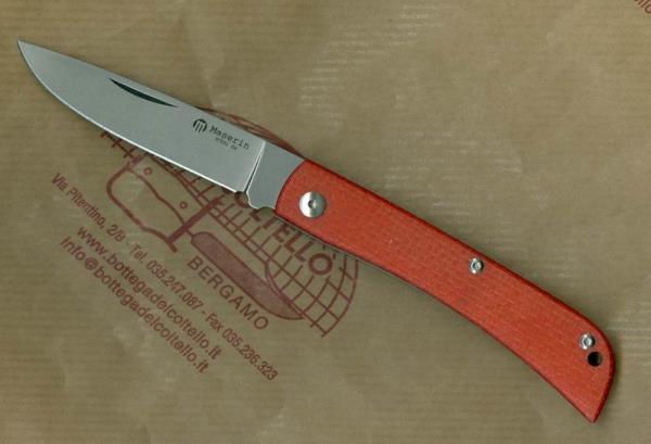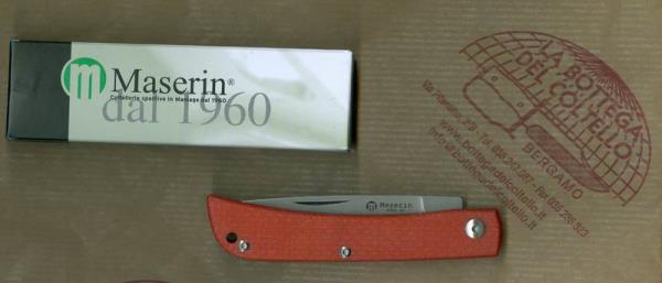 Maserin, coltellerie sportive in Maniago dal 1960. Scout Line - Cod. 163/MB Coltello chiudibile con lama in acciaio D2 e guancette in micarta ROSSA. Dimensioni: lunghezza totale mm 185, lama mm 80, chiuso mm 100, peso gr 70. Confezione: scatoletta di cartoncino.
