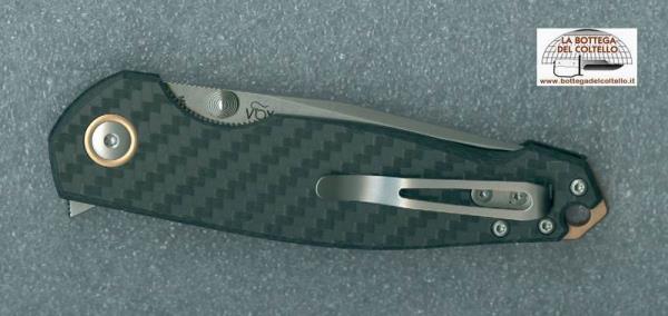 Lama: acciaio sinterizzato Böhler M390 temperato e trattamento criogenico; durezza HRC 59/61. Arrotatura piana, spessore 4 mm, satinata. Meccanismo di blocco: liner lock in acciaio inossidabile temperato W.Nr.1.4116. Distanziale: in bronzo fosforoso monoblocco, lavorazione CNC. Manico: fibra di carbonio. Clip: titanio sagomato. Viti: acciaio AISI 303; ghiera in bronzo. Meccanismo di rotazione: cuscinetti reggispinta. Pesco 105gr, lunghezza totale 198mm, lunghezza lama 82mm. Confezione: scatola in cartone rinforzato con logo.