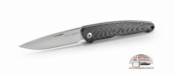 Lama: acciaio inossidabile Böhler M390 MICROCLEAN temperato sottovuoto; doppio rinvenimento e trattamento criogenico; durezza HRC 60/61; spessore 3 mm versione satinata. Cartella: doppie cartelle arrotondate in acciaio inossidabile W.Nr.1.4034 temperato. Guancette: FIBRA DI CARBONIO. Lavorazione CNC. Distanziale: molla arrotondata con lavorazione a lima in acciaio temperato W.Nr.1.4034. Elementi di fissaggio: vite pivot e viti di fissaggio in acciaio inossidabile AISI 303/304. Meccanismo di rotazione: sistema Slipjoint con rondelle in bronzo. Confezione: bustina in pelle e scatola in cartone.