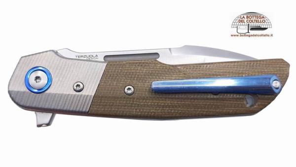 Coltello chiudibile Clap, con impugnatura in micarta verde e mostrine in titanio, disegnato da Bob Terzuola e prodotto in Italia dal Consorzio MKM.