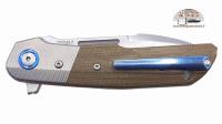 MKM Maniago Knife Makers Ref. MK LS01-GCT Coltello chiudibile con lama in acciaio BOHLER M390 satinata, apertura con flipper rimovibile e unghia per apertura a due mani, meccanismo di rotazione con cuscinetti a sfera. Liner lock in acciaio inox, distanziale e clip solida in titanio anodizzato blu. Manico in Canvas micarta verde e mostrine in titanio Ti6AI4V. Venduto con fodero sintetico con chiusura lampo e passacintura.
