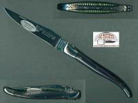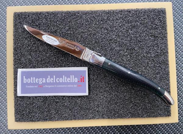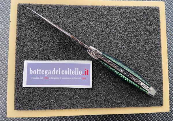 Laguiole origine garantie appartiene ad una serie di coltelli caratterizzati dal reticolo a nido d'ape riprodotto sull'impugnatura. Il modello qui proposto ha il manico di colore VERDE esaltato dalla finitura lucida dell'acciaio inossidabile 12C27.