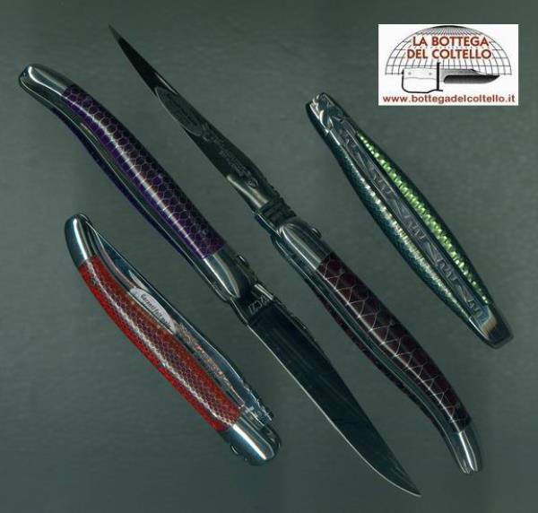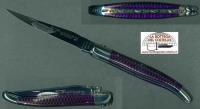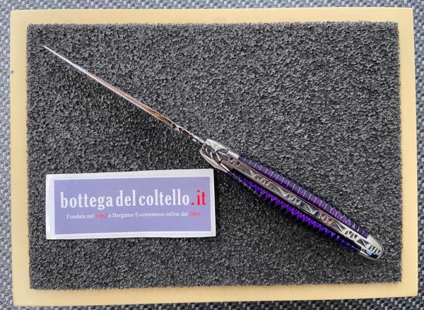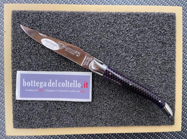 Laguiole origine garantie - appartiene ad una serie di coltelli caratterizzati dal reticolo a nido d'ape riprodotto sull'impugnatura. Il modello qui proposto ha il manico di colore VIOLa esaltato dalla finitura lucida dell'acciaio inossidabile 12C27.