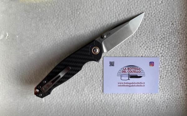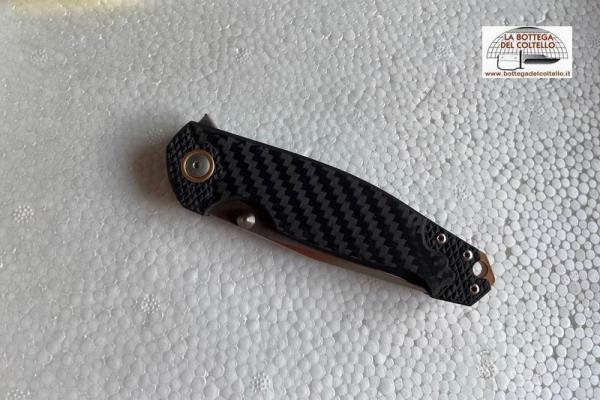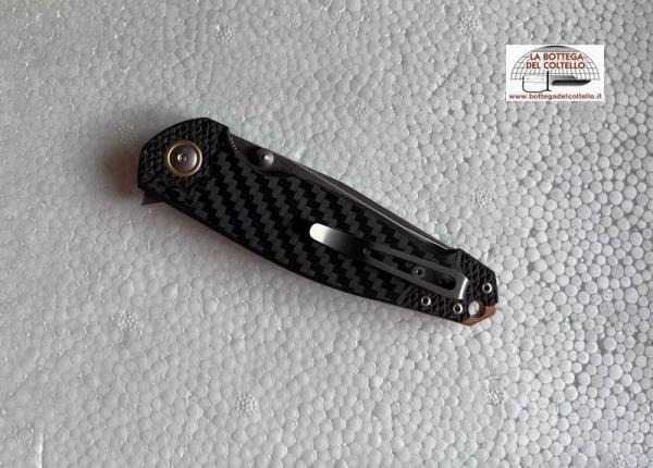Lama: acciaio sinterizzato Böhler M390 temperato e trattamento criogenico; durezza HRC 59/61. Arrotatura piana, spessore 4 mm, SATINATA. Meccanismo di blocco: liner lock in acciaio inossidabile temperato W.Nr.1.4116. Distanziale: in bronzo fosforoso monoblocco, lavorazione CNC. Manico: FIBRA DI CARBONIO con lavorazione 3D. Clip: titanio sagomato. Viti: acciaio AISI 303; ghiera in bronzo. Meccanismo di rotazione: cuscinetti reggispinta. Peso 105gr, lunghezza totale 198mm, lama 82mm. Confezione: scatola in cartone rinforzato con logo.