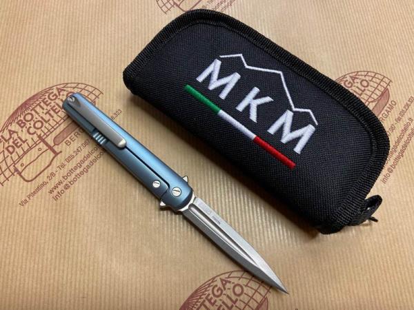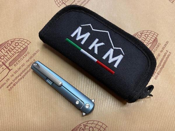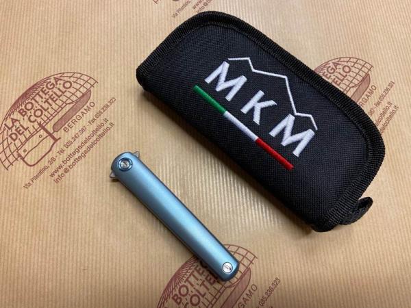 MKM Maniago Knive Makers Art. MK FL02-TBSV FLAME, coltello chiudibile pratico e leggero, con lama a daga ad un solo lato tagliente in acciaio BOHLER M390 stonewashed, apertura flipper con meccanismo di rotazione con cuscinetti a sfera. Frame lock in titanio anodizzato blu sabbiato. Distanziale e viteria in acciaio inox e clip solida in titanio sabbiata. Manico in titanio Ti6AI4V anodizzato blu sabbiato. Contenitore in cordura incluso nella confezione.