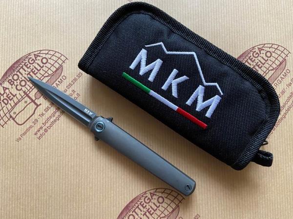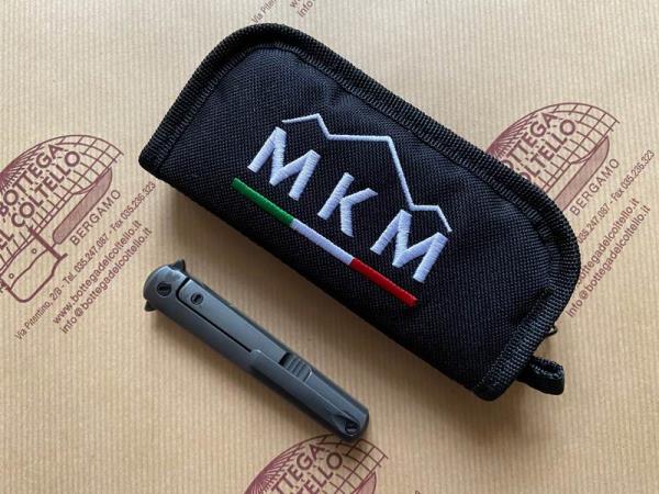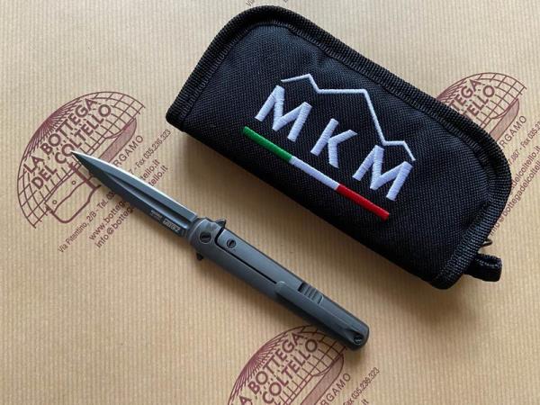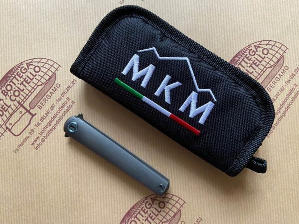 MKM Maniago Knive Makers Art. MK FL02-TDSW FLAME, Coltello chiudibile pratico e leggero, con lama a daga ad un solo lato tagliente in acciaio BOHLER M390 dark stonewashed, apertura flipper con meccanismo di rotazione con cuscinetti a sfera. Frame lock in titanio dark stonewashed. Distanziale e viteria in acciaio inox finitura PVD e clip solida in titanio dark stonewashed. Manico in titanio dark stonwashed Ti6AI4V. Contenitore in cordura incluso nella confezione.