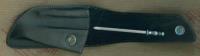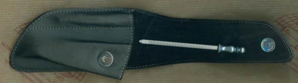 Fodero per coltelli chiudibili Opinel tradizionali n. 09 e 010. In cuoio nero, ha bottone a pressione, clip rotante, acciaino da 100 mm con impugnatura color acciaio. Il fodero chiuso misura circa 170mm.