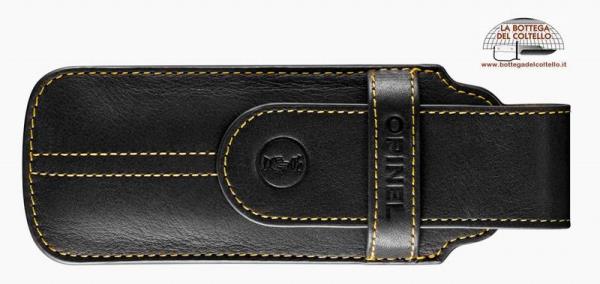 Fodero CHIC in pelle nera e impunture gialle, con passante, senza bottone. Dimensioni chiuso: ~ mm 125 x 50. Opinel Savoia Francia.
