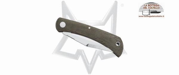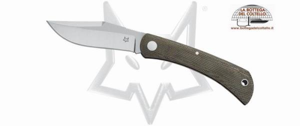 Fox Knives Art. FX-582 Coltello chiudibile con le seguenti caratteristiche pubblicate dal produttore: Lama acciaio inox M390 - Durezza HRC 59-60 - Manico Micarta OD green - Lunghezza Lama 7 cm 2.75 ” - Lunghezza totale 15,5 cm 6.10 ” - Spessore 3 mm 0.12 ” - Peso 45 g 1.58 oz.