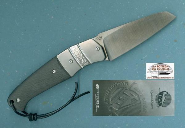 Gentleman style, Coltello chiudibile Novis qui proposto con le mostrine in titanio cesellato e l'impugnatura in fibra di carbonio: molto elegante, un vero “gentleman's knife”.
