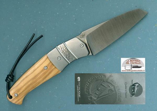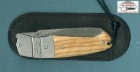 Gentleman style, Coltello chiudibile Novis qui proposto con le mostrine in titanio cesellato e l'impugnatura in pregiato legno d'ulivo: molto elegante, un vero “gentleman's knife”.