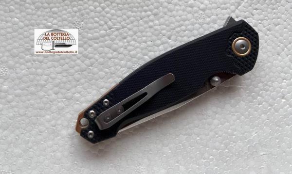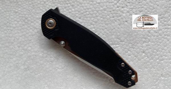 Lama: acciaio sinterizzato Böhler M390 temperato e trattamento criogenico; durezza HRC 59/61. Arrotatura piana, spessore 4 mm, stone washed. Meccanismo di blocco: liner lock in acciaio inossidabile temperato W.Nr.1.4116. Distanziale: in bronzo fosforoso monoblocco, lavorazione CNC. Manico: G10 nero con lavorazione 3D. Clip: titanio sagomato. Viti: acciaio AISI 303; ghiera in bronzo. Meccanismo di rotazione: cuscinetti reggispinta. Peso 107gr, lunghezza totale 198mm, lama 82mm. Confezione: scatola in cartone rinforzato con logo.