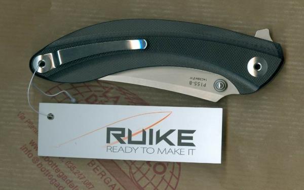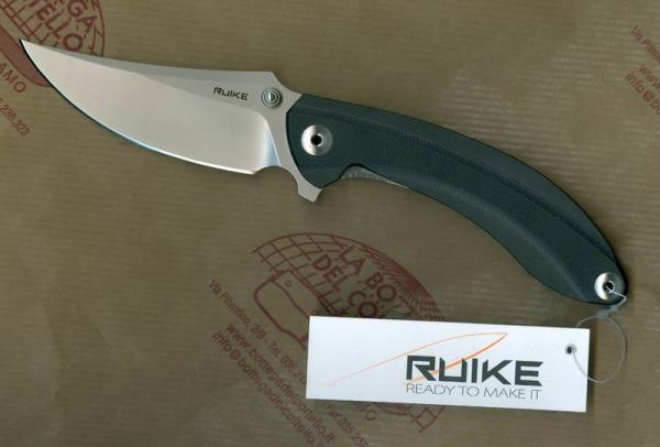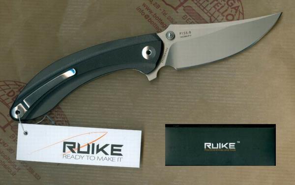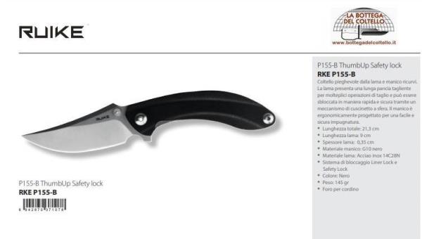 Ruike Art. P155-B Coltello chiudibile. La lama presenta una lunga pancia tagliente per molteplici operazioni di taglio e può essere sbloccata in maniera rapida e sicura tramite un meccanismo di cuscinetto a sfera. Il manico è ergonomicamente progettato per una facile e sicura impugnatura. Dimensioni: lunghezza totale mm 213, lunghezza lama mm 90, spessore lama mm 3,5, peso gr 145. Materiale manico: G-0 nero. Materiale lama: acciaio inox 14C28N. Sistema di bloccaggio liner lock e safety lock. Colore: nero. Foro per eventuale cordino (non incluso). Confezione: scatola di cartoncino.