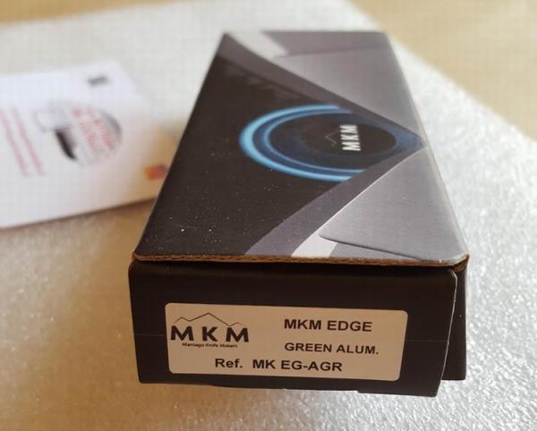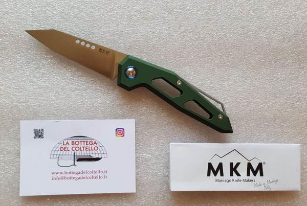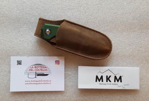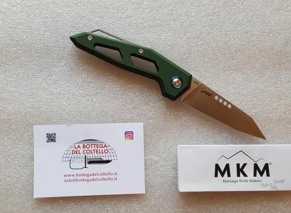 Ref. MK EG-AGR Caratteristiche tecniche pubblicate dal Produttore: Lunghezza lama: 75 mm, 2,95 in - Lunghezza totale: 175 mm, 6,89 in - Spessore lama: 2,5 mm, 0,10 in - Peso: 55 g - 1,94 oz - Lama: BÖHLER M390, satinata, 58 - 60 HRC - Sistema di apertura: due mani, finger holes - Sistema di chiusura: Slip joint - Molla: acciaio inossidabile - Viti: acciaio inossidabile - Manico: alluminio anodizzato verde - Fodero: in pelle, da tasca, con clip magnetica - Confezione: scatola di cartoncino.