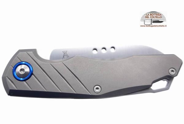 MKM Maniago Knife Makers Ref. MK RT-T Coltello chiudibile slip joint con lama in acciaio Bohler M390 satinata, e manico in titanio Ti6AI4V sabbiato. I tre fori sulla lama, posizionati nel punto di leva migliore per un'apertura più agevole, sostituiscono la classica "unghia" d'apertura oltre a renderlo più contemporaneo e accattivante. Molla e viteria in acciaio inox. Venduto con fodero in pelle con clip magnetica.