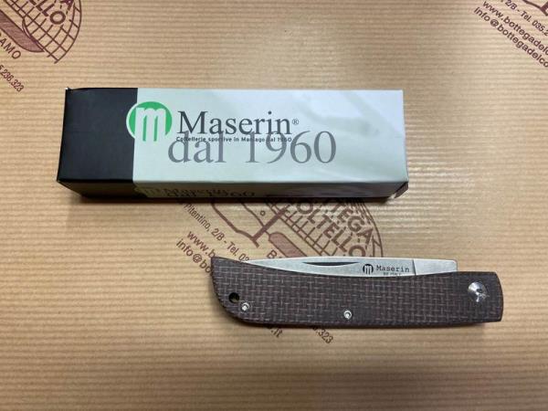Maserin, coltellerie sportive in Maniago dal 1960. Scout Line - Cod. 163/MG Coltello chiudibile con lama in acciaio D2 e guancette in micarta. Dimensioni: lunghezza totale mm 185, lama mm 80, chiuso mm 100, peso gr 70. Confezione: scatoletta di cartoncino.