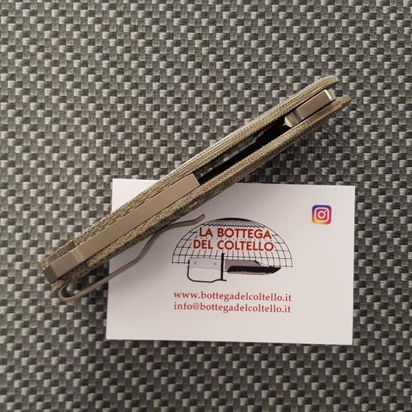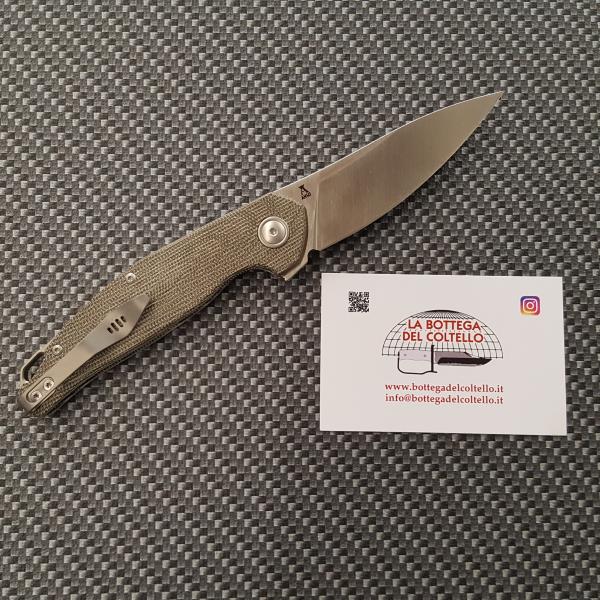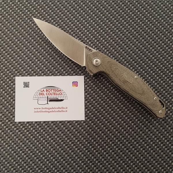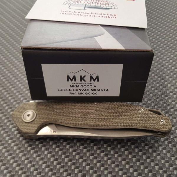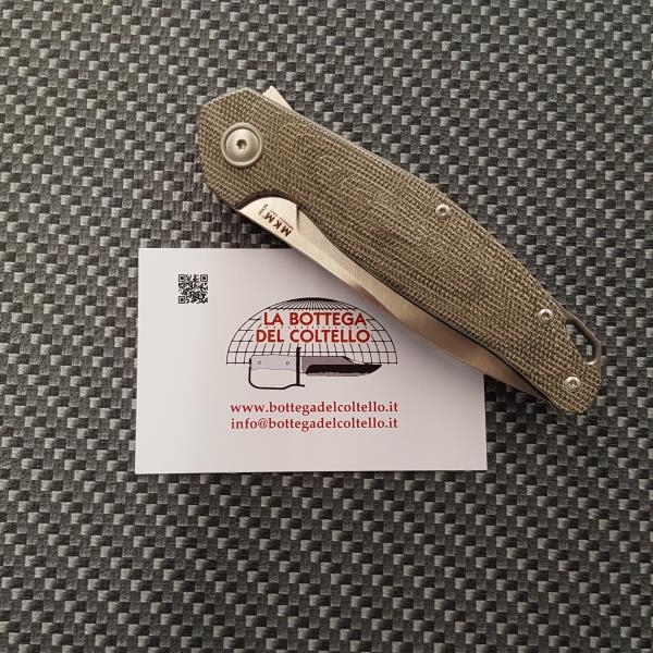 MKM Coltello Goccia è un flipper con manico in canvas micarta verde disegnato da Jens Anso e costruito in Italia dal Consorzio Coltellinai di Maniago.