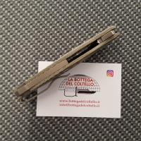 Maniago Knife Makers Art. MK GC-GC Coltello pieghevole Goccia ha sull'impugnatura una particolare lavorazione a ellissi che evoca la sensazione di una goccia che cade direttamente nell'acqua. Viene venduto con fodero in cordura con zip e passa cintura.