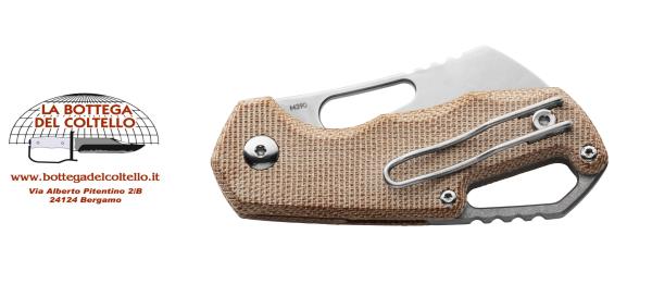 Il manico è in micarta canvas naturale con clip reversibile in acciaio inox.