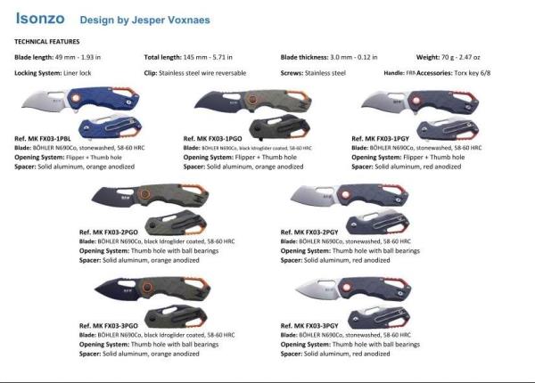 Questo è MKM - Maniago Knife Makers - Ref. MK FX03-3PGO ISONZO CLIP POINT GREEN FRN Coltello chiudibile con le seguenti caratteristiche tecniche pubblicate dal produttore: