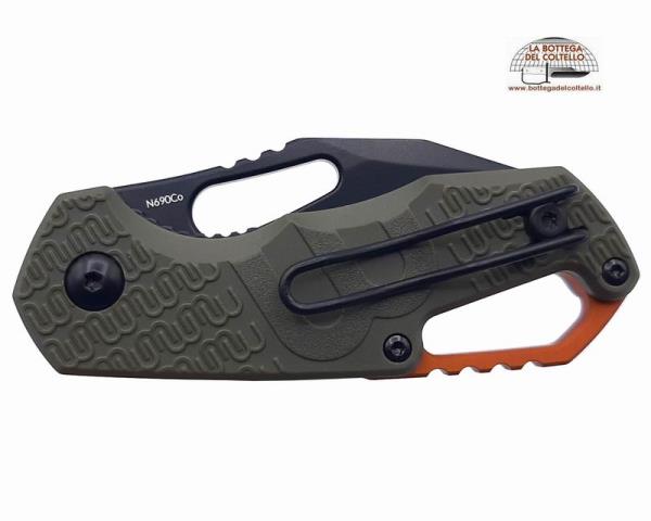 Lama: BOHLER N690Co, black idroglider coated, HRC 58-60 - Manico: FRN GREEN - Peso: 70g - Spessore lama: 3.0 mm - Lunghezza lama: 49mm - Sistema di apertura: foro pollice con cuscinetti a sfera - Distanziale: alluminio anodizzato con foro per moschettone - Clip: a filo, reversibile in acciaio inox - Imballo: Scatola di cartoncino. Acccessori: chiave torx 6/8.