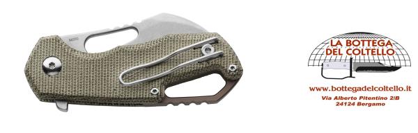 Il manico è in micarta canvas verde con clip reversibile in acciaio inox.