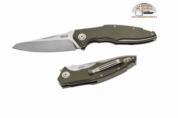 Questo è MK VP01-GF GR Raut G-10 verde, front flipper - Caratteristiche pubblicate dal produttore: lunghezza lama 85 mm - Spessore lama 4 mm - Lunghezza totale 204 mm - Peso: 135 gr - Manico: frame in titanio Gr.5Ti6AI4V anodizzato blu, guancette in G-10 verde - Acciaio lama: Bohler M390 Microclean, HRC 58-60 - Accessori: astuccio in materiale sintetico con chiusura lampo e passacintura. Confezione: scatola di cartone.