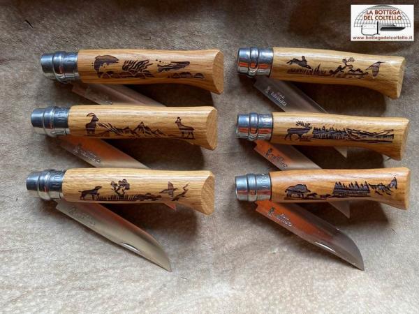 Opinel 8 Animalia, serie di sei coltelli chiudibili con figure di animali incise a laser sul manico, edizione 2019. Sobria e bella!
