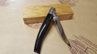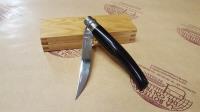 L'impugnatura più stretta favorisce la collocazione in tasca, la lama affusolata gli conferisce qualità di taglio ineguagliate, la linea elegante ne fa un perfetto coltello da tavola. Lama cm 10 in acciaio inossidabile, finitura a specchio. Blocca-lama in apertura e chiusura. Impugnatura in corno. Contenitore in legno.