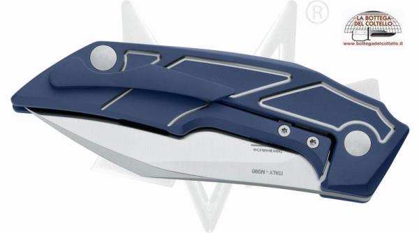 Art. FX-531TI BL Coltello chiudibile prodotto in Italia da Fox. Lama: Acciaio inossidabile Bohler M390 Isomatrix da metallurgia delle polveri ( C 1,90% Cr 20,0% Mo 1,0% V 4,0%) - HRC 58-60. Lunghezza lama: 8,5 cm. Lunghezza totale: 20 cm. Spessore: 4 mm. Peso: 150 gr. Manico: titanio blu anodizzato. Clip: titanio. Astuccio in cuoio. Confezione: scatola di cartoncino.