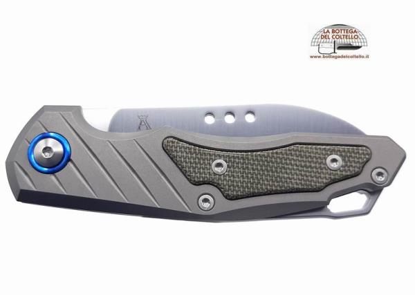 MKM Maniago Knife Makers Ref. MK RT-GCT Coltello chiudibile slip joint con lama in acciaio Bohler M390 satinata, e manico in titanio Ti6AI4V sabbiato con inserto in canvas micarta verde. I tre fori sulla lama, posizionati nel punto di leva migliore per un'apertura più agevole, sostituiscono la classica "unghia" d'apertura oltre a renderlo più contemporaneo e accattivante. Molla e viteria in acciaio inox. Venduto con fodero in pelle con clip magnetica.