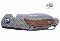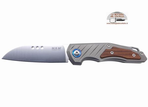 MKM Maniago Knife Makers Ref. MK RT-ST Coltello chiudibile slip joint con lama in acciaio Bohler M390 satinata, e manico in titanio Ti6AI4V sabbiato con inserto in LEGNO SANTOS. I tre fori sulla lama, posizionati nel punto di leva migliore per un'apertura più agevole, sostituiscono la classica "unghia" d'apertura oltre a renderlo più contemporaneo e accattivante. Molla e viteria in acciaio inox. Venduto con fodero in pelle con clip magnetica.