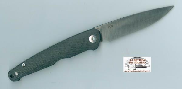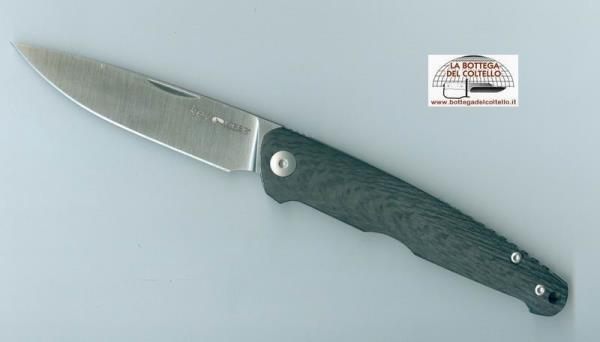 Lama: acciaio inossidabile Böhler M390 MICROCLEAN temperato sottovuoto; doppio rinvenimento e trattamento criogenico; durezza HRC 60/61; spessore 3 mm versione satinata. Cartella: doppie cartelle arrotondate in acciaio inossidabile W.Nr.1.4034 temperato. Lavorazione CNC. Guancette: fibra di carbonio, lavorazione CNC. Distanziale: molla arrotondata con lavorazione a lima in acciaio temperato W.Nr.1.4034. Elementi di fissaggio: vite pivot e viti di fissaggio in acciaio inossidabile AISI 303/304. Meccanismo di rotazione: sistema Slipjoint con rondelle in bronzo. Confezione: bustina in pelle e scatola in cartone.