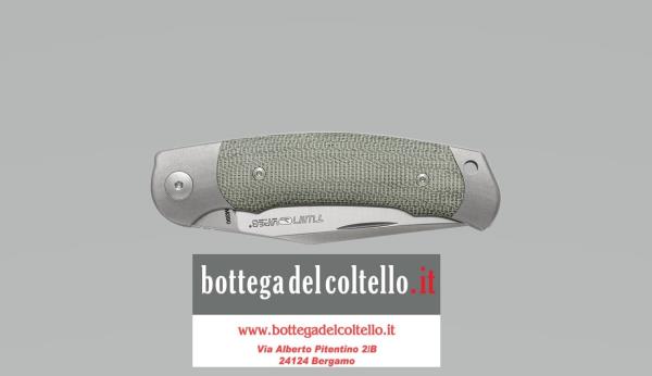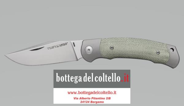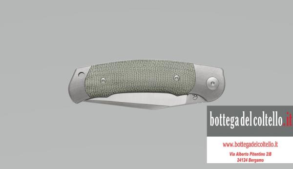 Twin CG Designed by Fabrizio Silvestrelli. Coltello chiudibile slipjoint, lama satinata da 3mm di spessore. Manico titanio monoblocco con due mostrine e guancette in canvas micarta verde.