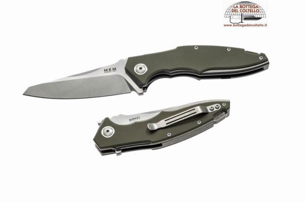 Questo è MK VP01-GB GR Raut G-10 verde, flipper - Caratteristiche pubblicate dal produttore: lunghezza lama 85 mm - Spessore lama 4 mm - Lunghezza totale 204 mm - Peso: 135 gr - Manico: frame in titanio Gr.5Ti6AI4V anodizzato blu, guancette in G-10 verde - Acciaio lama: Bohler M390 Microclean, HRC 58-60 - Accessori: astuccio in materiale sintetico con chiusura lampo e passacintura. Confezione: scatola di cartone.